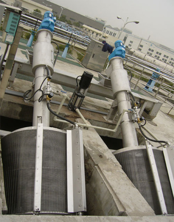 旋轉清污網筒在水中以35°傾角做每分鐘5~8r/min的圓周運動,網筒的1/3浸沒在水中。污水及漂浮物從網筒下口進入網筒內部,漂浮物附著于網筒內壁從水中帶出,當網筒轉到高點,雜質由于重力作用掉入垃圾輸送系統,經輸送壓榨至出料口。被過濾的污水經過網筒間隙流走。