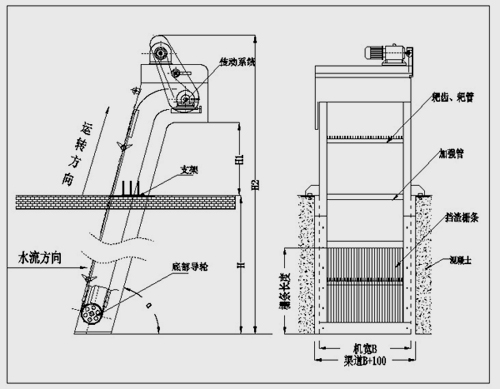 反撈式格柵每小時過水流量:Q=K*(B-160)*h*V*3600,其中: